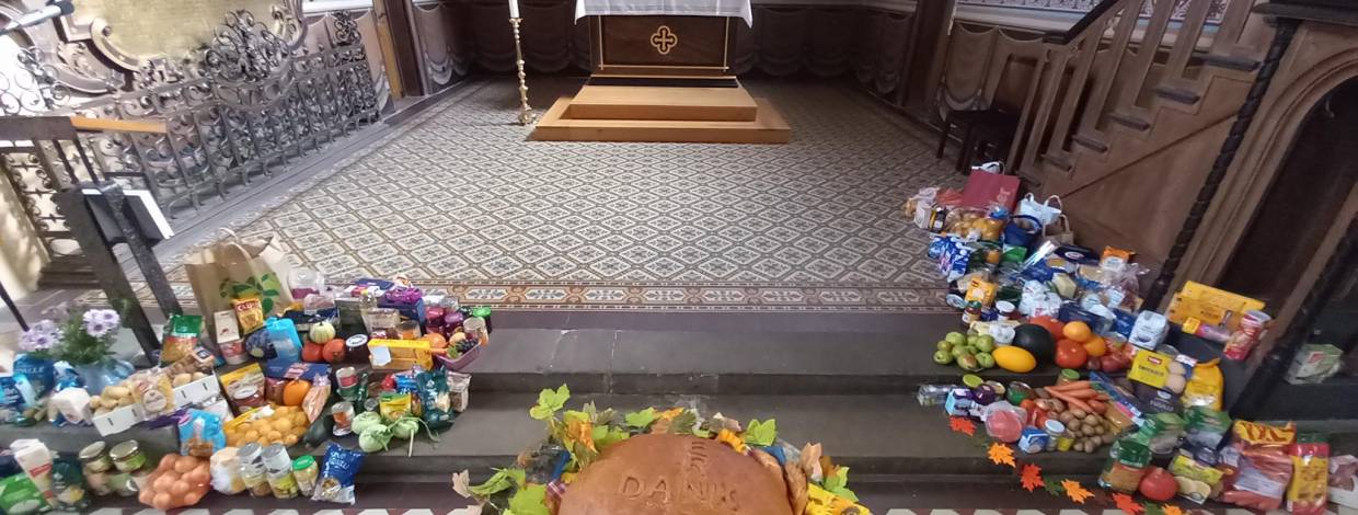 Beeindruckend war der Anblick des Altarraumes. Zahlreiche Lebensmittel hatten die Kinder als Erntedankgabe mitgebracht.