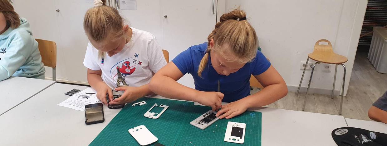 Ein Höhepunkt des Tages war das Auseinanderbauen alter Handys. Dabei konnten wir genau sehen, aus welchen Bauteilen ein Smartphone besteht und welche Rohstoffe darin verborgen sind. Beim Zerlegen der Handys entdeckten wir kleine goldene Kontakte auf den Platinen. Wir erfuhren, dass Gold wegen seiner guten Leitfähigkeit in fast jedem Smartphone steckt, aber nur in winzigen Mengen. Auch fanden sie winzige Bauteile aus Quarz, die dafür sorgen, dass das Handy die richtige Zeit anzeigt.