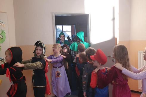 Am Rosenmontag verwandelte sich auch unsere Schule. Ein geheimnisvoller Zwerg tauchte in jedem Klassenzimmer auf und suchte nach jemandem ganz Besonderen. Die Spannung stieg, als kurze Zeit später ein weiterer Zwerg mit einer Laterne auftauchte, der alle Kinder mit einer fröhlichen Polonaise aus den Klassenzimmern abholte und in die Turnhalle führte. Nach kurzer Verwunderung und einer kleinen Suche fanden die Lehrer-Zwerge endlich ihr Schneewittchen, was für große Begeisterung und Erleichterung!
